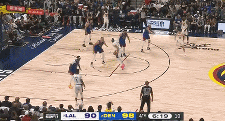 第三节,约基奇背身强吃詹姆斯得手!湖人75-89掘金