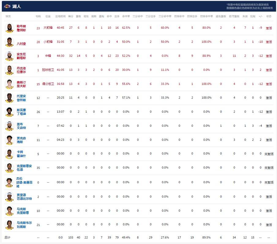 洛杉矶湖人戴维斯32分14板5助4帽,詹姆斯27分6板8助1断1帽,拉塞尔13分3板3助2断。
