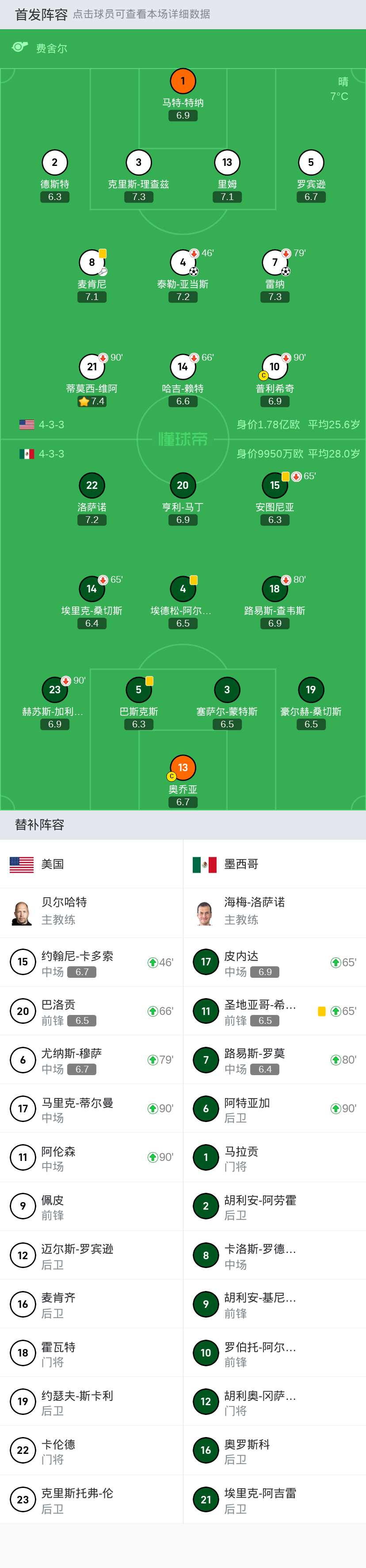替换下场:46'4-泰勒-亚当斯, 66'14-哈吉-赖特, 90'+310-普利希奇, 90'+221-蒂莫西-维阿, 79'7-雷纳