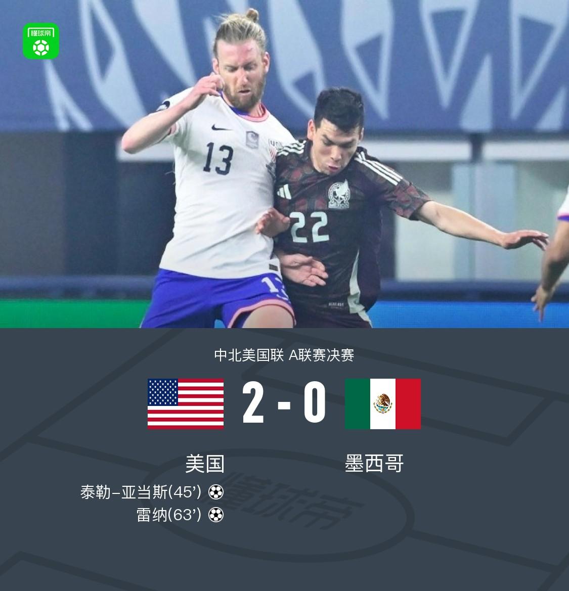 北京时间3月25日中北美国联 A联赛决赛,美国主场对阵墨西哥。上半场最后阶段,麦肯尼助攻泰勒亚当斯远程重炮轰门,打破场上僵局。下半场,雷纳补射破门将场上比分扩大,圣地亚哥-希门尼斯禁区内假摔吃到黄牌。最终美国2-0战胜墨西哥,夺得中北美国联A联赛冠军。
