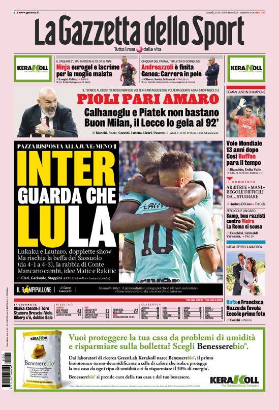 1.卢卡库和劳塔罗双双梅开二度,国米距离尤文只差1分。孔蒂在萨索洛主场过关,紧追榜首,不过比赛最后阶段(从4-1到4-1)让孔蒂失去耐心:球队遭受了考验。
