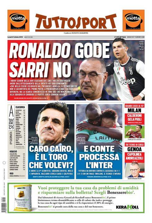 直播吧10月21日讯 米兰体育报、罗马体育报、都灵体育报是意大利的三大体育报,今天我们来看看它们各自的头版头条都带来了哪些内容。