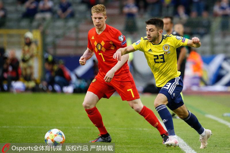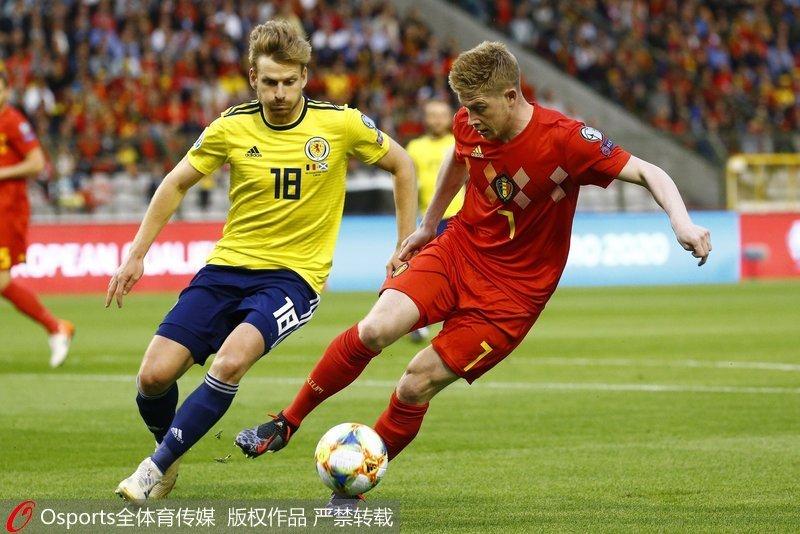 人民网北京6月12日电(马翼)北京时间6月12日凌晨,2020欧预赛I组第4轮,比利时主场迎战苏格兰。上半场,德布劳内直面门将将球打高,阿扎尔助攻卢卡库头球打破僵局。易边再战,德布劳内射门被扑卢卡库补射得手,完成梅开二度。伤停补时阶段,德布劳内远射破门锦上添花。最终,比利时3-0战胜苏格兰,取得欧预赛4连胜。