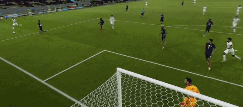 第66分钟,法国队打入一球,姆巴佩在左路接到后场传球,内切入禁区左侧,连续晃动过人后一脚搓射打入球门死角,可惜越位在先,进球无效。