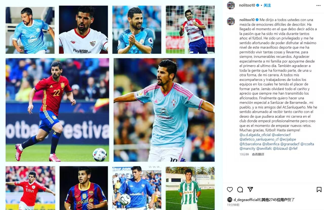 现年36岁的前西班牙国脚诺利托在社交媒体发文宣布退役,这位西班牙前锋曾效力过巴萨、曼城、塞尔塔、塞维利亚等球队。