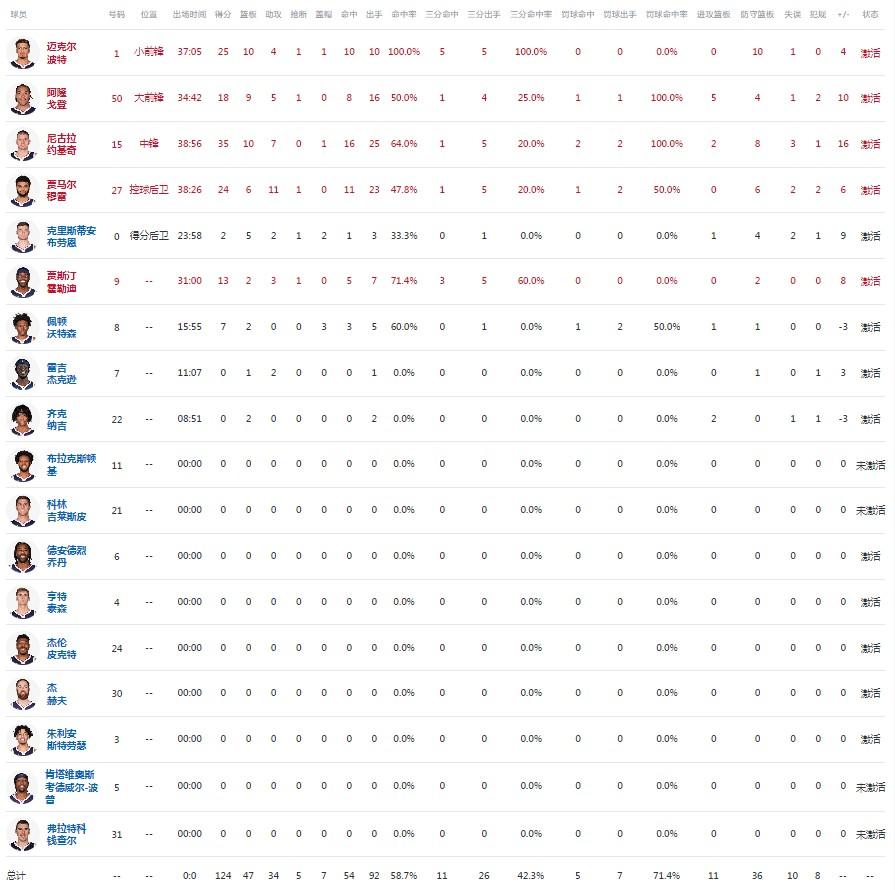 丹佛掘金贾马尔-穆雷29分7板11助2断,小波特27分8板2助1帽,约基奇24分12板9助3帽。