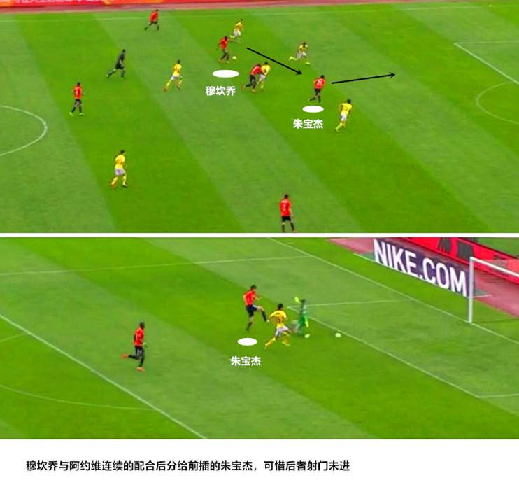 但阵型进一步前提之后,恒大也暴露出了身后空间。尤其在人和反击时,恒大无法保证回防到位率,很容易被人和打穿。如上图的进攻片段,则是人和在运动战中,两名外援连续配合后由穆坎乔分球给前插的朱宝杰,后者直接获得了单独面对曾诚的机会,可惜射门没有打进。恒大在丢球后心情焦急,导致阵型很松,让朱宝杰能准确到弱侧冲击。