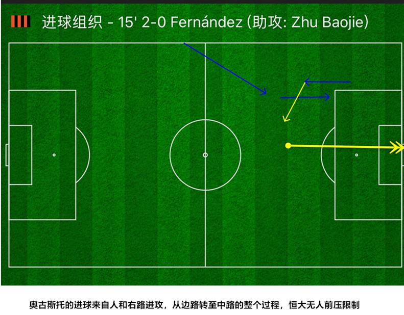 如上图战术板所示,奥古斯托的进球来源于人和在右路的配合,随后又转移到中路交给前场的奥古斯托,在整个过程中,恒大没有任何人上前抢断或者限制,让奥古斯托有了充足的观察和射门时间。