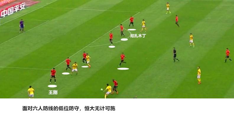 其次,在领先后,北京人和交出了控球权,将防守精力主要集中在禁区和禁区前沿,整体落入低位防守。如上图所示,人和对于防线的要求极高,两名边前卫王刚和替补上场的尼扎木丁必须要深度回撤,与防线保持平行站位,形成了6后卫阵型。在边肋区域和中路完全压缩空间,恒大只能盲目传中,或者由中场球员在外围打远射。表面占据着优势,其实并没有实质性的威胁。