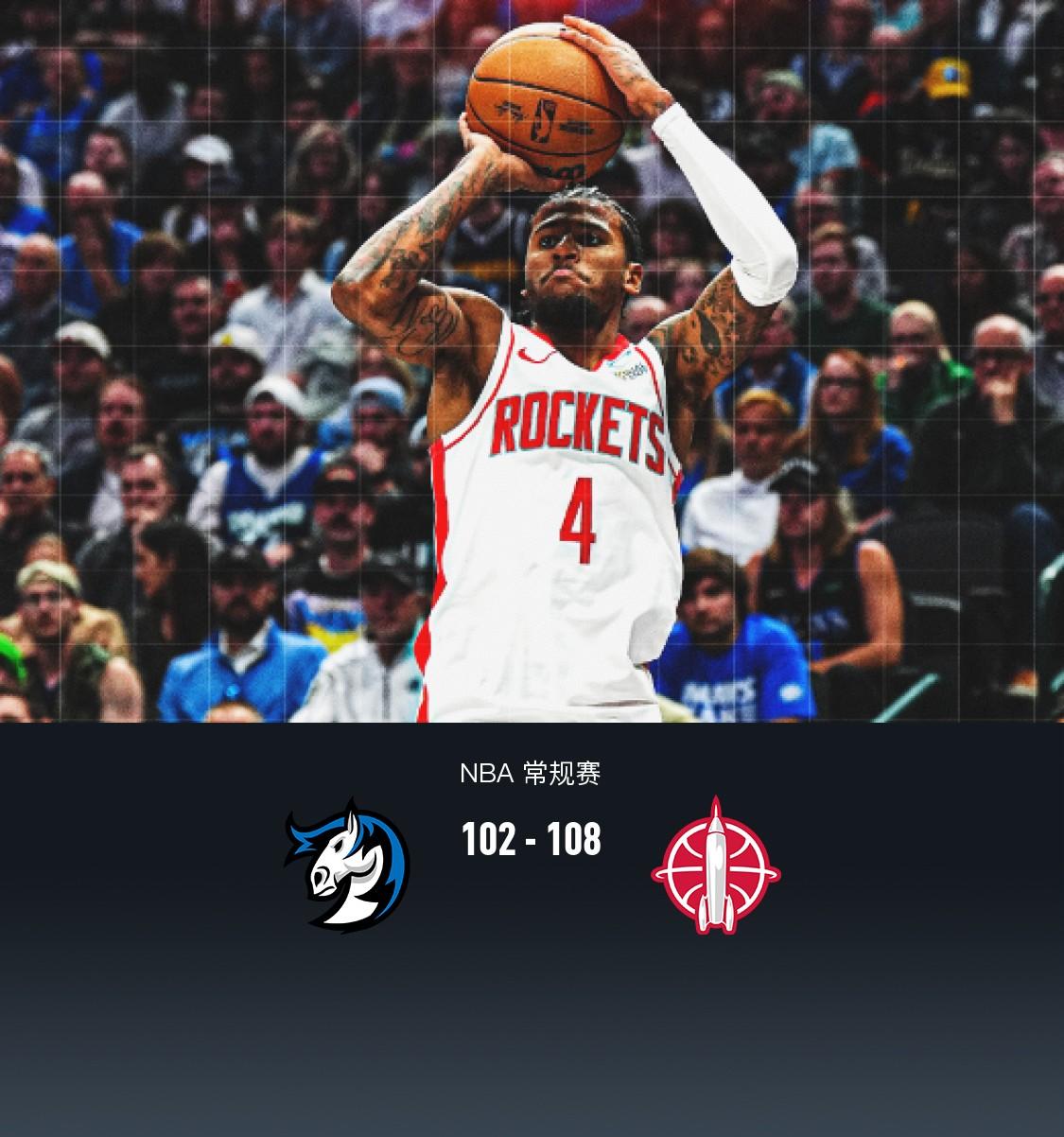 第四节独行侠东契奇拿下15分,火箭杰伦-格林拿下10分,最终独行侠102-108不敌火箭