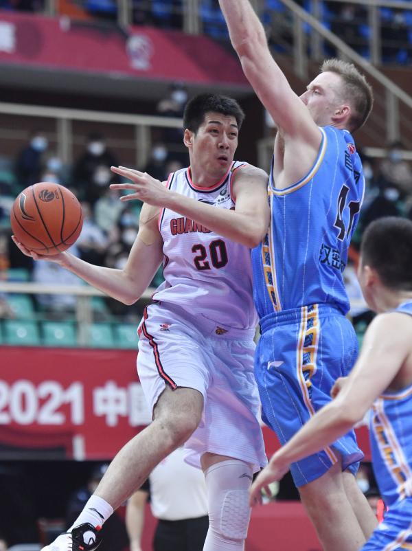 ↑广东东莞大益队球员任骏飞(左一)在比赛中传球。