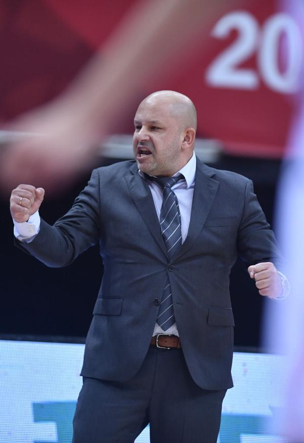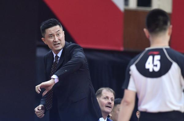 ↑北京首钢队主教练雅尼斯在比赛中指挥。