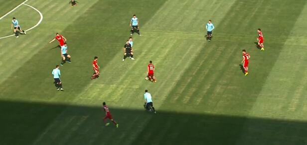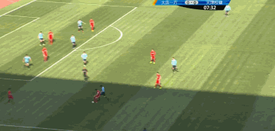 第30分钟,一方队前场打出任意球配合,发球队员横传架炮,朱晓刚三十米开外重炮轰门,皮球贴着草皮直奔死角而去,杨君侧扑用指尖将球碰出底线。