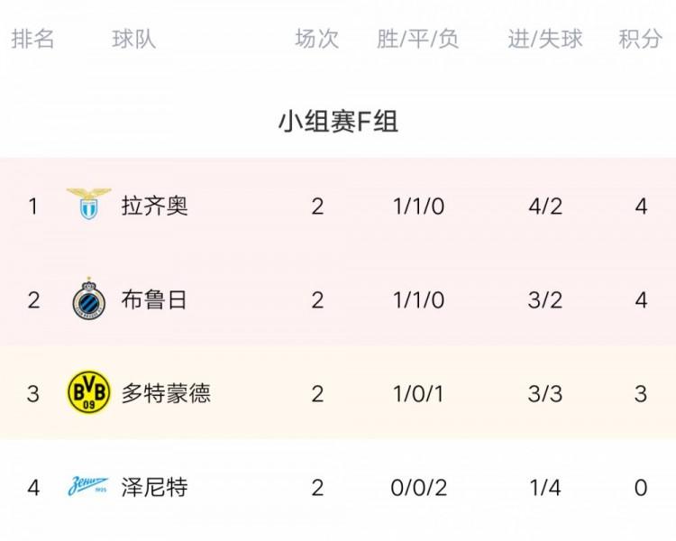 上半时双方均无建树。下半时小阿扎尔替补造点,桑乔罚进打破僵局,尾声阶段贝林厄姆助哈兰德再下一城。本轮战罢,多特2-0泽尼特,拉齐奥1-1布鲁日。拉齐奥4分,布鲁日4分,多特3分,泽尼特0分。