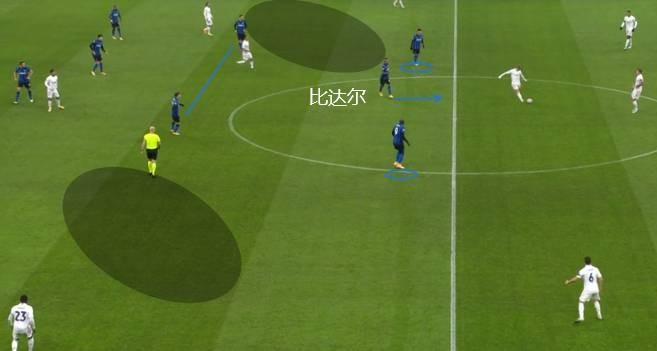 来看上图,比达尔顶上,配合双前锋试图压迫皇马后场。此时后卫线身前只有巴雷拉和加利亚尔迪尼。可以看到两个中场身侧空间都非常大。皇马可以通过将球转移到边路来利用这些空当。