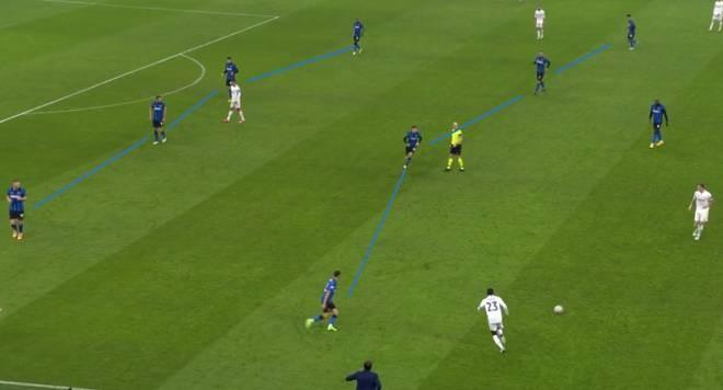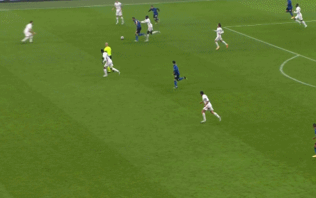 当球转移到边路后,卢卡库是回防了一段距离的,但这并不够。纳乔在继续向前推进的过程中没有遇到阻力,直到巴雷拉来到边路。由于中前卫补边路,后腰比达尔前顶来不及回防,左边中卫什克里尼亚尔必须顶上盯防阿扎尔。此时国米防线轮转到位,但已是他们所能做到的极限了。