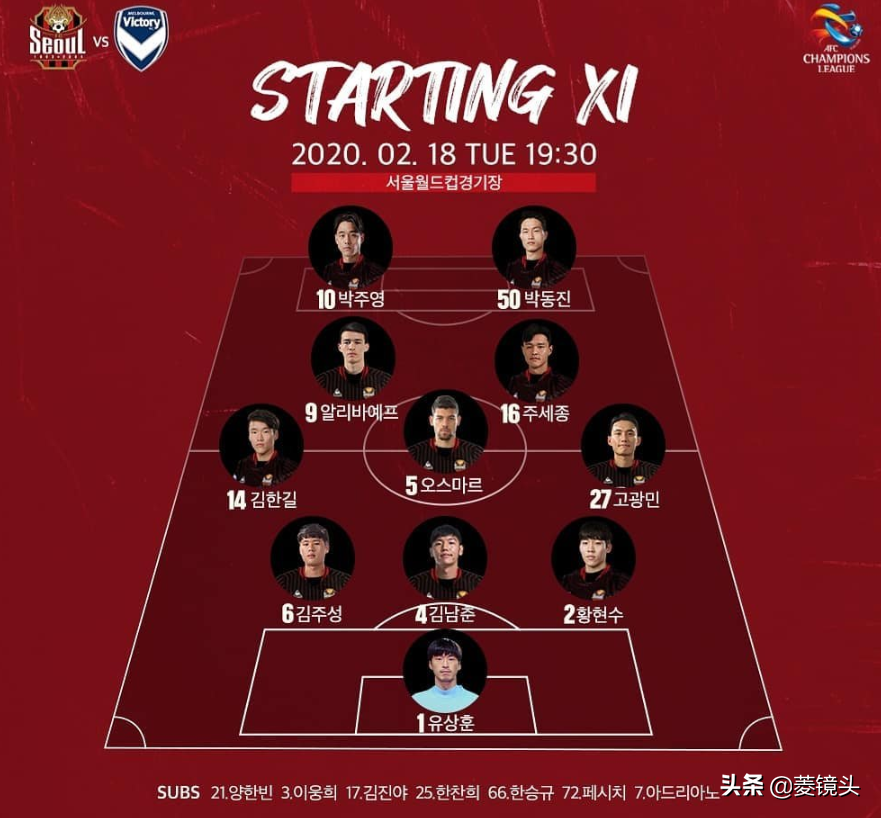 首尔FC首发阵容:1-柳相勳;6-金朱晟、4-金南春、2-黄贤秀;14-金汉吉、9-阿里巴耶夫、5-奥斯马尔、16-朱世钟、27-高光民;10-朴主永、50-朴东辰