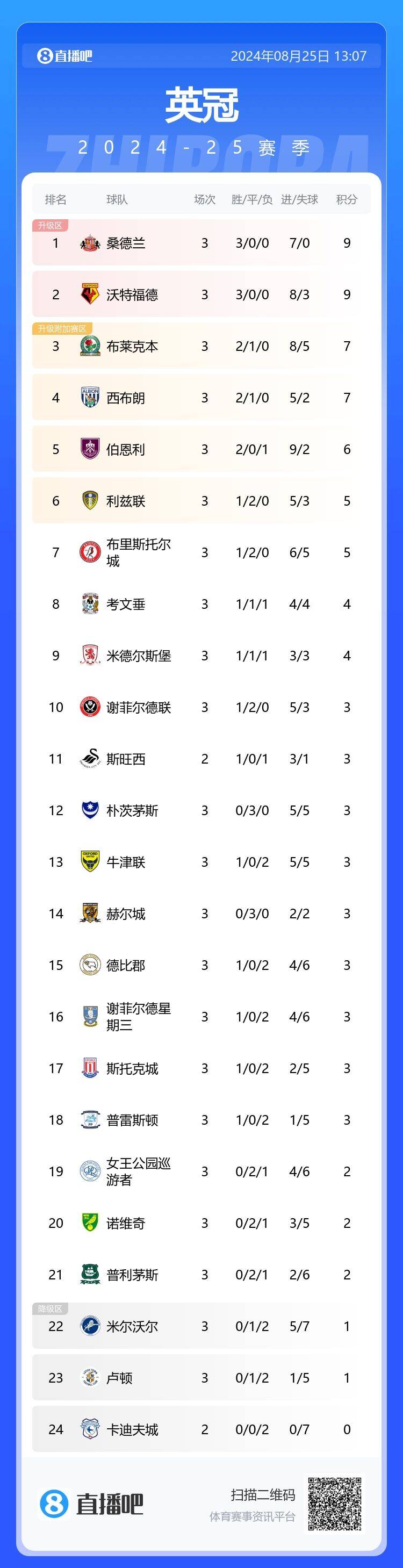 排在第二的沃特福德同样是三战全胜。上赛季降级的三兄弟,谢菲联(扣2分)与伯恩利分列第10和第5,卢顿一胜难求深陷降级区。