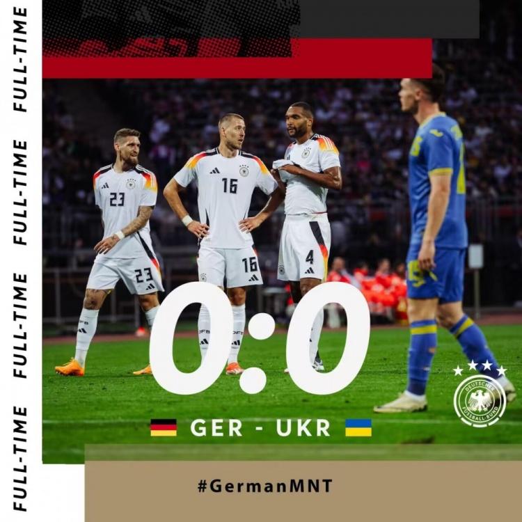 直播吧6月4日讯 北京时间6月4日凌晨2点45分,2024年足球友谊赛展开角逐,德国对阵乌克兰。上半场德国场面压制但未能收获进球,下半场拜尔替补中柱,穆勒禁区倒地未判点,诺伊尔出击失误险送礼。最终德国0-0战平乌克兰,德国全场27脚射门未果。
