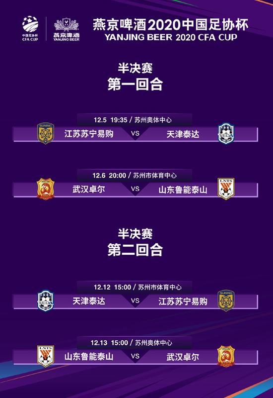 人民网北京12月3日电 2020中国足协杯半决赛赛程出炉,两组对决分别为江苏苏宁VS天津泰达,武汉卓尔VS山东鲁能。首回合比赛在12月5日和6日打响,次回合的较量安排在12月12日和13日。