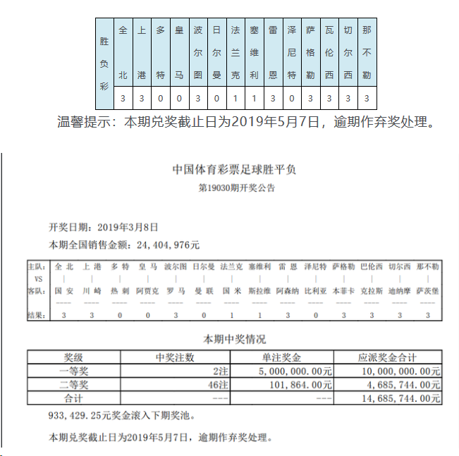 北京时间03月08日,胜负彩第19030期开奖结果揭晓,本期一等奖开出2注,单注奖金500万元,93.3万奖金滚存至周五足彩;二等奖开出46注,单注奖金10.1万多元。任九开出326注34109元。本期胜负彩销量为24,404,976元,任九投注总额为17,374,370元。