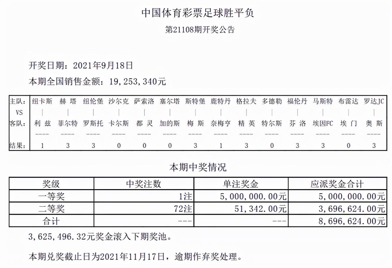 北京时间9月18日,胜负彩第21108期开奖结果揭晓。14场头奖1注500万,滚存362万至第21109期足彩,2等开出72注51342元,任九头奖381注28581元。本期胜负彩销量为19,253,340元,任九投注总额为17,015,172元。