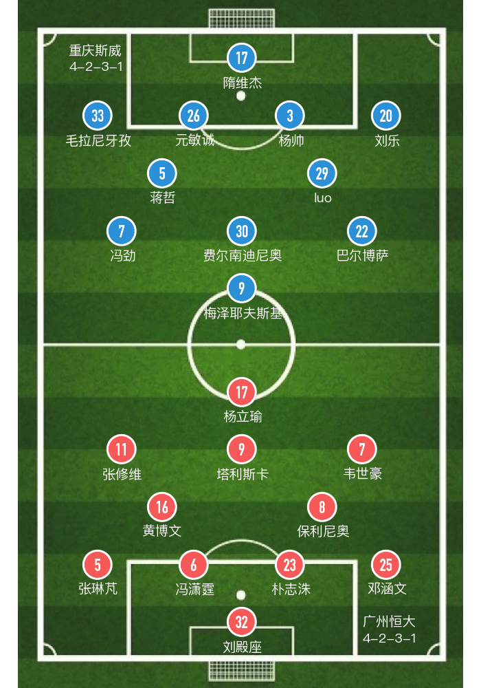 重庆斯威(4-2-3-1): 17-隋维杰,33-毛拉尼牙孜,26-元敏诚,3-杨帅,20-刘乐(85' 15-徐武),5-蒋哲(85' 8-丁捷),29-luo,7-冯劲,30-费尔南迪尼奥,22-巴尔博萨(71' 13-尹聪耀),9-梅泽耶夫斯基