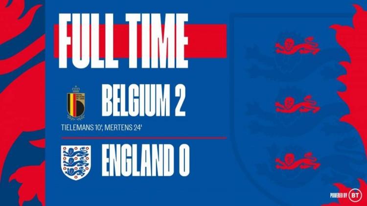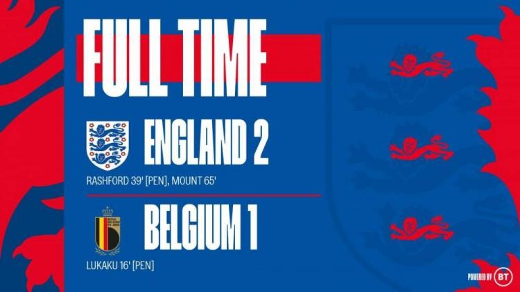全场比赛结束,英格兰主场2-1逆转比利时。