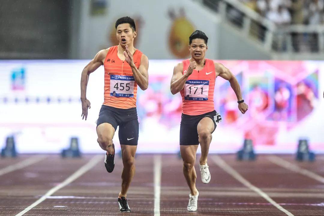 8月2日,谢震业(左)与苏炳添在比赛中。当日,在辽宁沈阳举行的2019世界田径锦标赛选拔赛男子100米决赛中,浙江选手谢震业以10秒03的成绩夺冠,广东选手苏炳添以10秒19的成绩获得亚军。