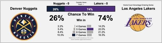 据数据分析统计,湖人在西决赢下掘金晋级总决赛的概率为74%。
