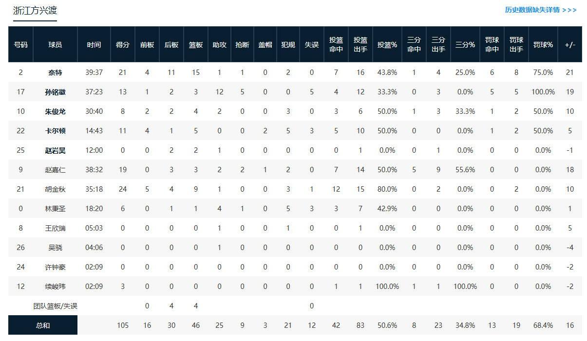 浙江方兴渡胡金秋24分9板1助,内森-奈特21分15板,赵嘉仁17分2助1断。