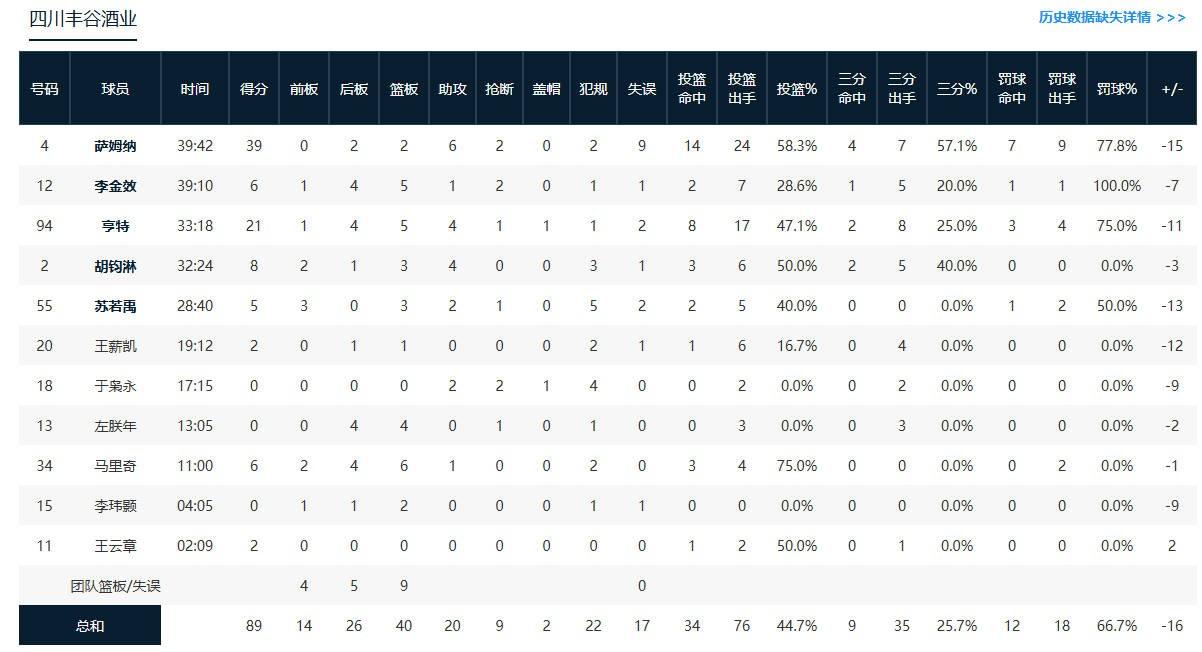 四川(2-7):萨姆纳39分2篮板6助攻,亨特21分5篮板4助攻,苏若禹5分3篮板2助攻,李金效6分5篮板,胡钧淋8分3篮板4助攻,王薪凯2分,马里奇6分6篮板,王云章2分
