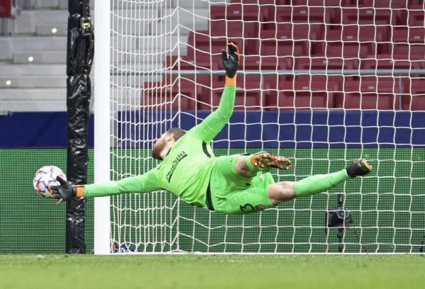 ↑图为马德里竞技队守门员奥布拉克在比赛中扑救。