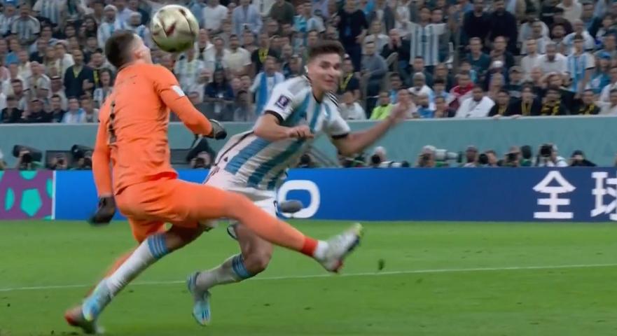 第31分钟,阿根廷送出长传,阿尔瓦雷斯被利瓦科维奇放倒,主裁判判罚点球。