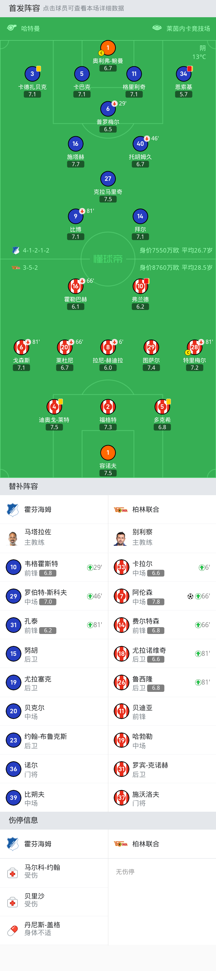 霍芬海姆 首发:1-奥利弗-鲍曼, 27-克拉马里奇, 3-卡德扎贝克, 11-格里利奇, 6-普罗梅尔, 9-比博, 34-恩索基, 5-卡巴克, 16-施塔赫, 14-拜尔, 40-托胡姆久