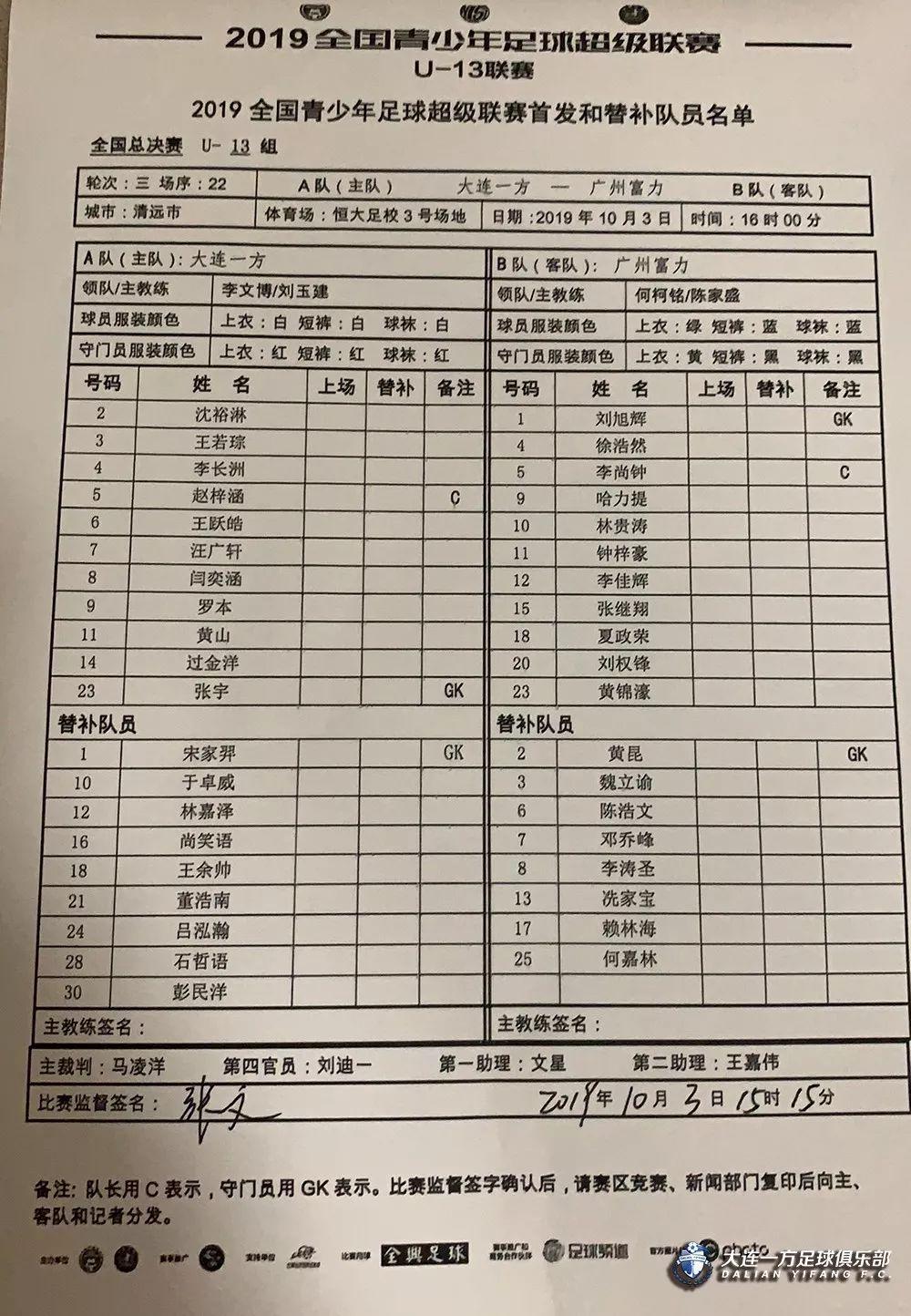 10月3日16:00,2019全国青少年足球超级联赛(U-13组)全国总决赛小组赛最后一轮在恒大足球学校展开,大连一方U13队对阵广州富力U13队。汪广轩上半场为大连一方打破僵局,于卓威下半场补时阶段推射空门得手,为大连一方锁定胜局,最终,大连一方2-0战胜广州富力。