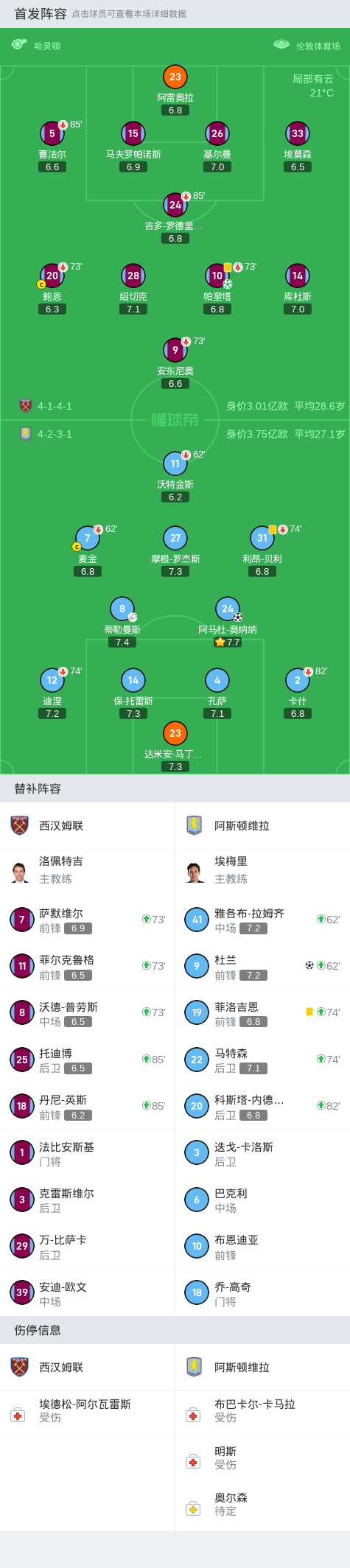 在英格兰足球顶级联赛首轮比赛中,西汉姆联坐镇主场迎战阿斯顿维拉。上半场,奥纳纳头球破门斩获维拉生涯首球,利昂-贝利小角度打门击中立柱,绍切克造点,帕奎塔点射扳平比分,半场结束,西汉姆联1-1维拉。