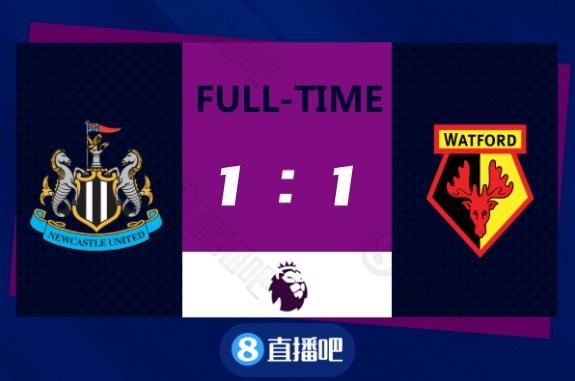 全场比赛结束,纽卡1-1战平沃特福德。