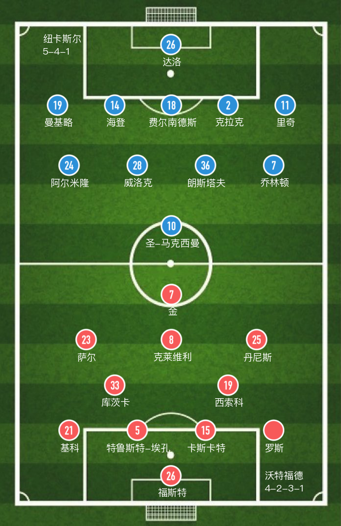 纽卡斯尔联:1-杜布拉夫卡、15-特里皮尔、5-沙尔、6-拉塞尔斯、3-杜梅特、21-弗雷泽(74' 23-墨菲)、36-肖恩-朗斯塔夫、8-谢尔维、7-乔林顿、10-圣马克西曼(86' 24-阿米尔隆)、20-克里斯-伍德