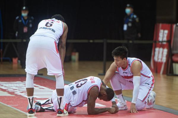 ↑11月3日,广东东莞大益队球员赵睿(右)、布鲁克斯(左)在比赛中查看队友威姆斯伤情。