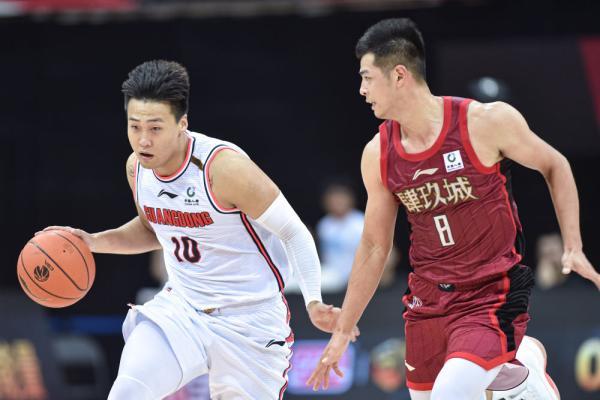 ↑11月3日,广东东莞大益队球员赵睿(左)在比赛中带球突破北京首钢队球员方硕的防守。