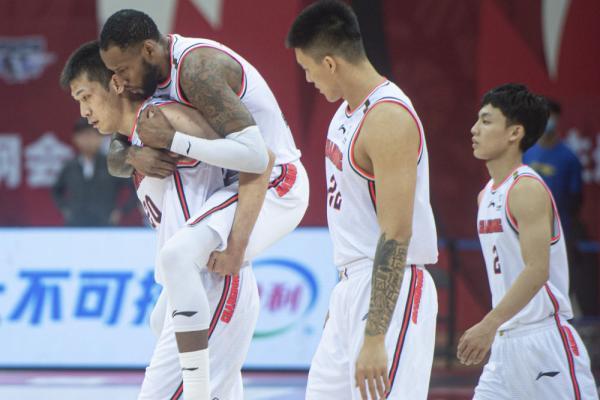 ↑11月3日,广东东莞大益队球员威姆斯(左二)受伤后被队友任骏飞(左一)背出赛场。