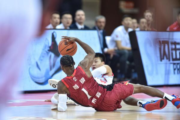 ↑11月3日,北京首钢队球员吉布森(前)在比赛中倒地拼抢。