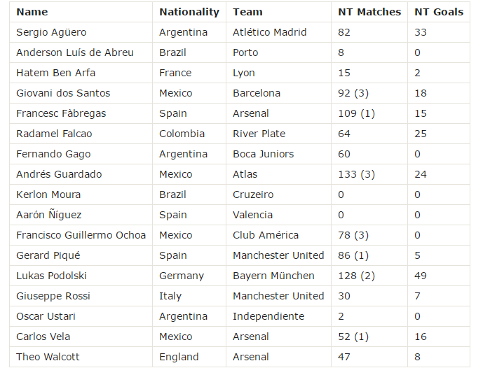 在“高潜小牛”名单中出现了众多如今的超级巨星。除去沃尔科特、法布雷加斯和波多尔斯基这样在2006年就已经家喻户晓的名字,这份名单中依然有阿奎罗、法尔考、伊瓜因、皮克这些在当时刚露头角的球员。