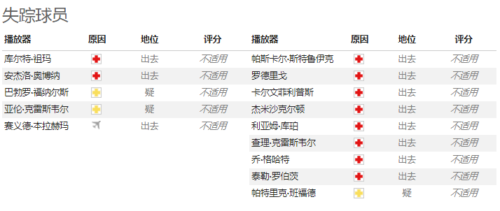 克雷斯韦尔、祖马和奥邦纳都是队内的伤病球员。
