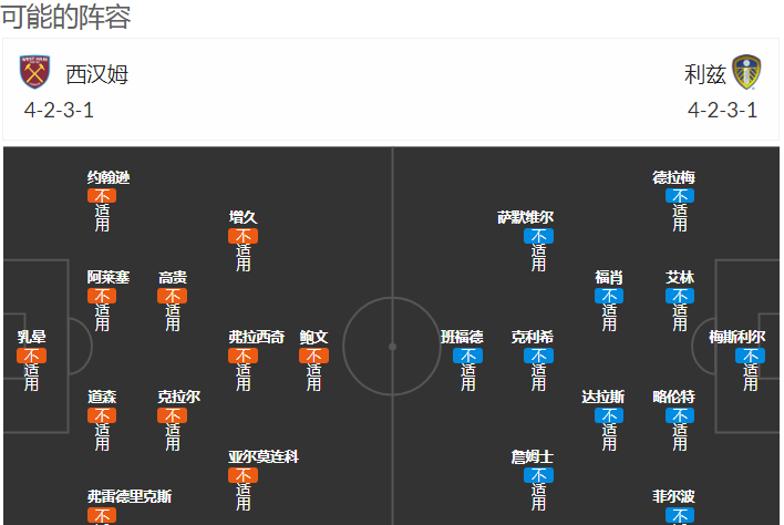 自利兹联升级到英超后,西汉姆联连续3场比赛对阵利兹联都取得了胜利,但是本场他们将派上稍弱的阵容。