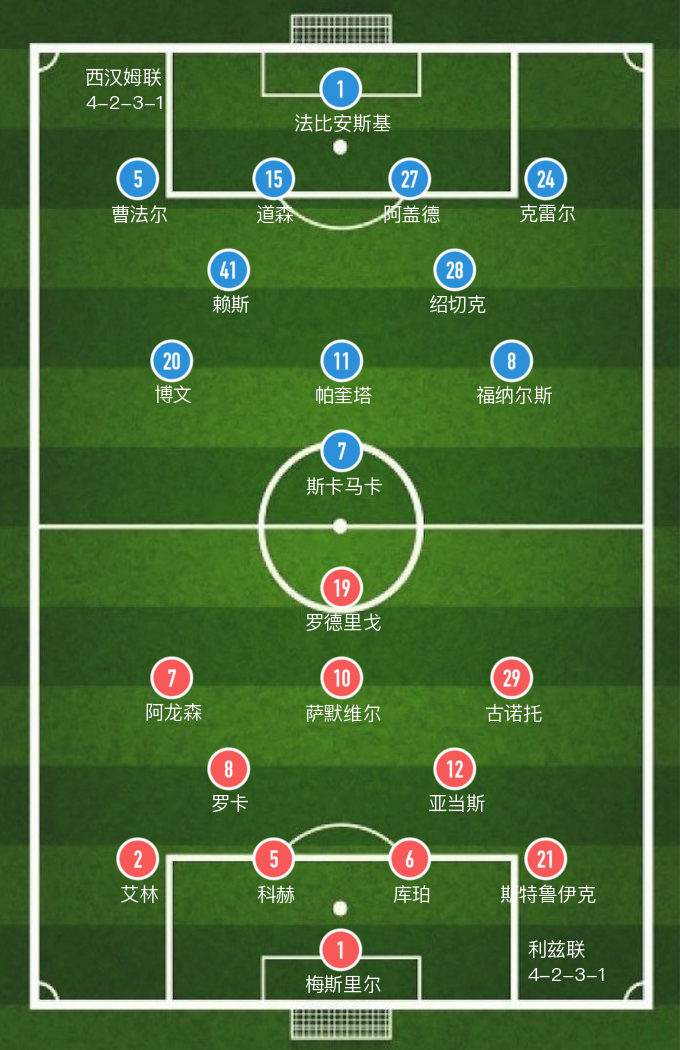 西汉姆联(4-2-3-1): 1-法比安斯基,5-曹法尔(68' 3-克雷斯韦尔),15-道森,27-阿盖德,24-克雷尔,41-赖斯,28-绍切克,20-博文,11-帕奎塔(81' 22-本拉赫玛),8-福纳尔斯(81' 12-弗林唐斯),7-斯卡马卡(68' 9-安东尼奥)