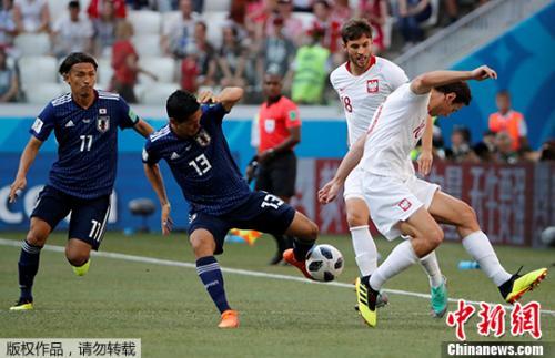 俄罗斯世界杯H组,波兰1:0小胜日本。图为双方争抢足球。