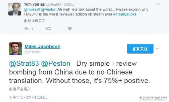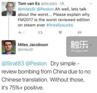 不过在汉化事件过去三个月之后,官方的汉化进度毫无音讯,Jacoboson却又在推特上抱怨起了中文差评。在被网友问及“为什么《足球经理2017》成了系列中Steam评价最差的游戏”这一问题时,Jacoboson回答:“很简单,因为没有中文翻译游戏的评价被中文差评刷爆了。没有这些(差评),好评率会有75%以上。”