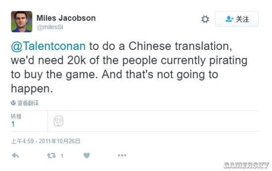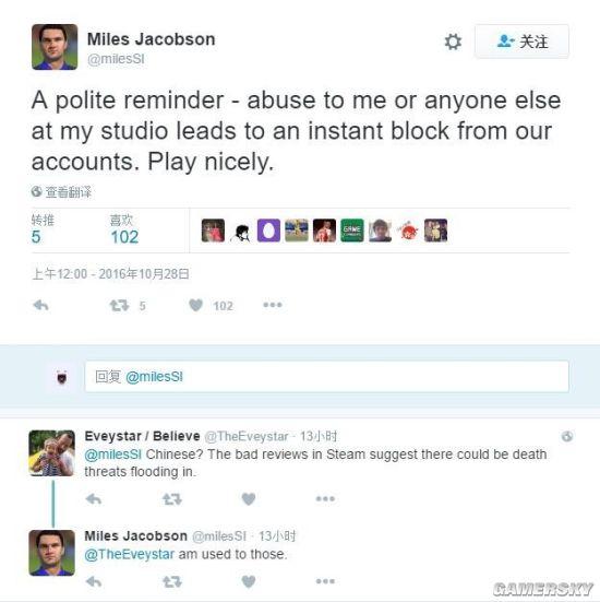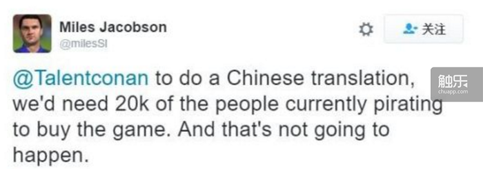 这位名叫Miles Jacobson的主管,昨天在Twitter上被人问到本作评价低的原因时,他的回复是:“太简单了——还不是因为没中文被刷的差评,要不肯定能有75%以上的好评率”。